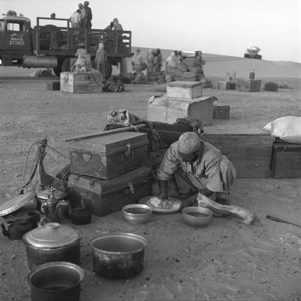 أما طعامهم فأكثر ما يكون من المعلبات، يطبخونها في المطابخ المتنقلة التي ترافقهم. وبالرغم من أن هذه الفرق تصطحب معها ما تحتاج من المواد والمعدات إلا أنها تظل تعتمد في تموينها إلى حد كبير على مراكز التموين البعيدة. ولذلك فإن المواصلات البرية والجوية بين مخيمات هذه الفرق ومراكز العمران لا تنقطع طيلة المدة التي تقضيها هذه الفرق في البراري.