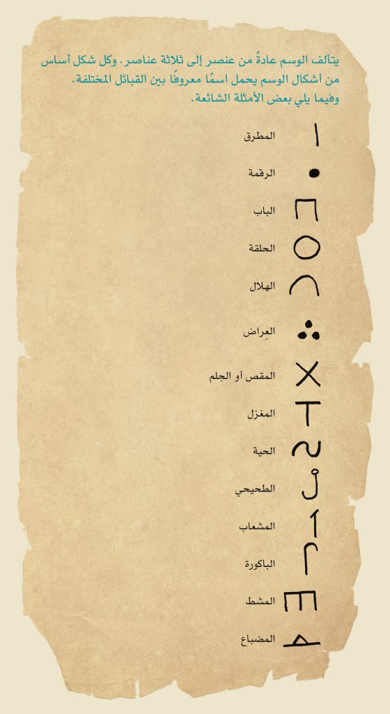 وربما استخدمت أكثر من قبيلة الوسم نفسه، لكن كل قبيلة تضع الوسم في مكان مختلف عن الأخرى، فقبيلة تضعه على الخد وأخرى على العنق وثالثة على الفخذ. تُرسم الوسوم عندما تكون الإبل في عمر 12 إلى 18 شهرًا، وكذلك خلال أشهر الصيف عندما تتجمع القطعان بالقرب من الآبار.