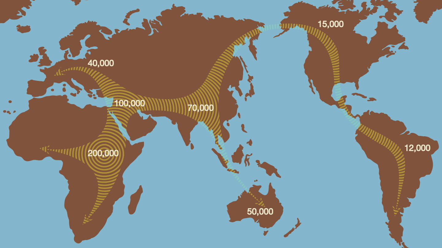 خريطة مسارات الهجرة البشرية عبر العصور الأولى.