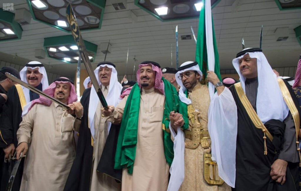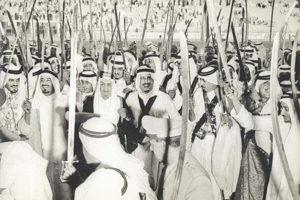 وتتقدَّم الراية نحو العاهل بتؤدة وكبرياء، وترتفع الدفوف مزركشة بكتل الخيوط الملونة وتهبط بإيقاع منتظم، وهي مرفوعة على سارية رفيعة محاطة بفرسان الملك وقادتهم الأبطال الذين يتقدَّمون ببطء متمايلين طربًا يلاعبون الأسنة والسيوف حتى يقتربوا من العرش. ثم يقومون بمحاكاة أحداث المعركة الأخيرة كما لو أنها حدثت بالأمس، ويصدحون بصوت واحد: “تحت بيرق سيدي، سمعٍ وطاعة”، مكررين مشهد المبايعة الذي حدث بين أجدادهم والملك عبدالعزيز بن عبدالرحمن الفيصل آل سعود.