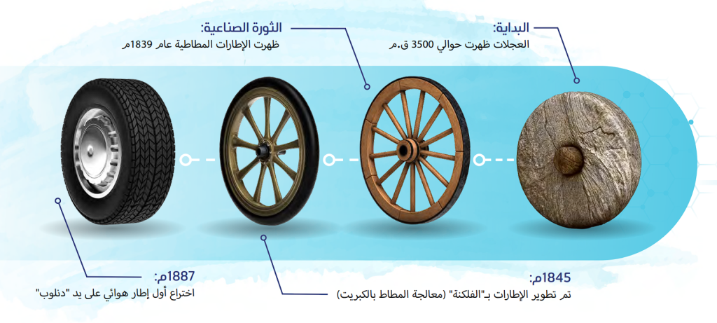 منذ أن اختُرعت حوالي عام 3500 قبل الميلاد، كانت العجلات تعاني دائمًا مشكلة التآكل والتلف السريع. والتطوُّر المهم الذي أُدخِل على العجلات، مع انطلاق الثورة الصناعية، هو الإطارات المطاطية. وكان الأوروبيون قد تعرفوا على المطاط الطبيعي في أواسط القرن الثامن عشر عندما جاء به مستعمرو أمريكا الجدد من شجرة المطاط هناك.