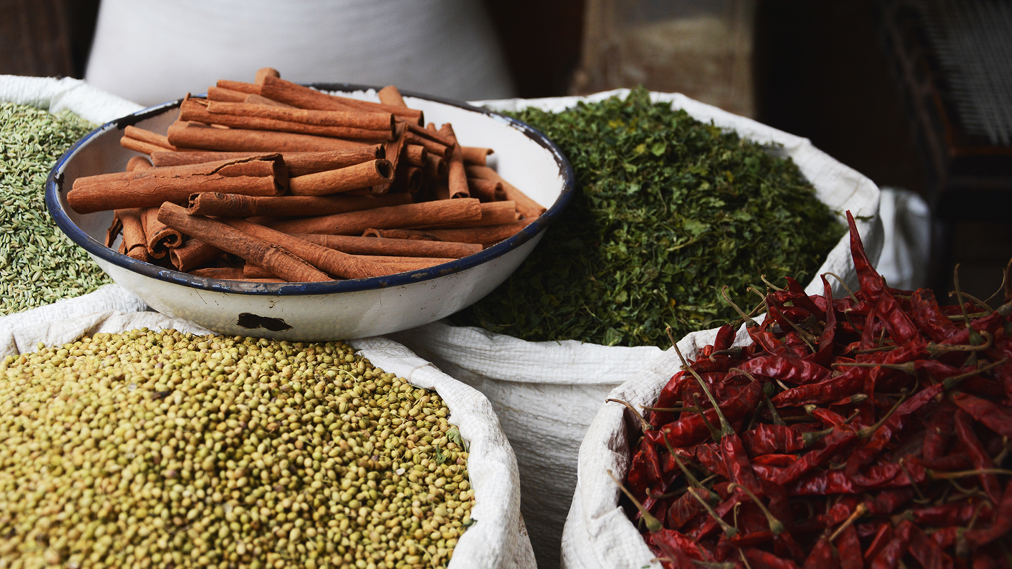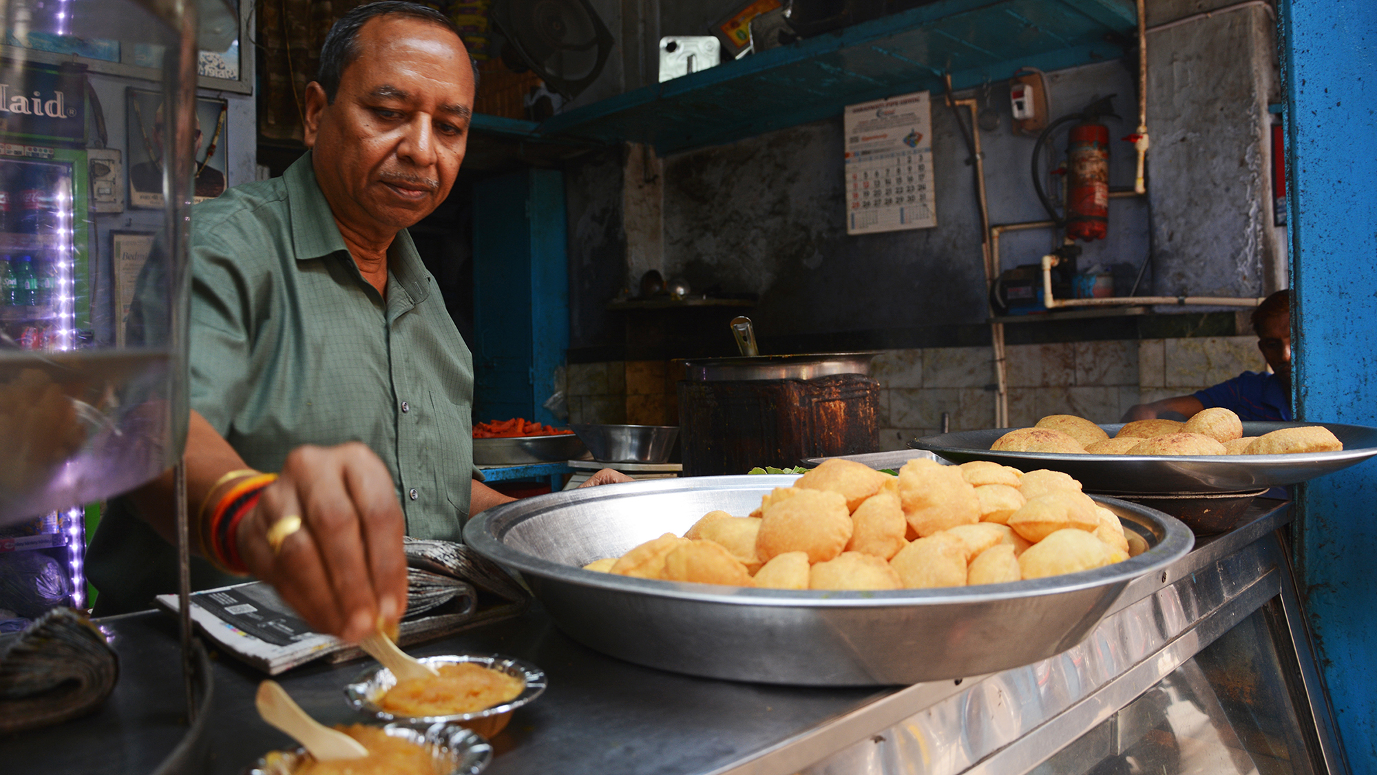 استخدام التوابل المعروضة هنا في سوق خاري باوري لبيع التوابل بالجملة. وإلى حدٍّ كبير، لا تزال هذه السوق كما كانت عليه في الفترة التي سبقت البلاط الحاكم للمغول والديكان. ريقة مثل سمبوسة الخويا.