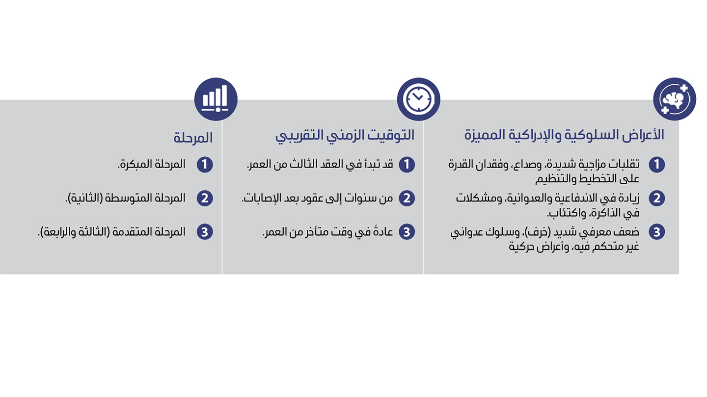 يتميز اعتلال الدماغ الرضحي بالتدهور في مجالين رئيسين: الإدراك والسلوك. في الجانب المعرفي، يعاني المصابون صعوبة في التفكير، وفقدان الذاكرة، ومشكلات في تخطيط المهام وتنظيمها وتنفيذها. أما في جانب السلوك، فتظهر أعراض مقلقة جدًّا، تشمل السلوك الاندفاعي والعدواني. ولكن، لهذا المرض جانب معقَّد، وهو تباين توقيت ظهور الأعراض. فقد يتغير السلوك والمزاج في سن مبكرة نسبيًّا، أحيانًا في العقد الثالث من العمر، في حين يتأخر الخلل الوظيفي الذهني إلى مرحلة لاحقة. هذا التباين في الظهور يشكّل تحدّيًا بالغًا أمام الطب الشرعي؛ إذ إن تحديد مدى تأثير الأعراض السلوكية المبكرة في الأهلية الجنائية للمتهم يتطلب الرجوع إلى تاريخ طويل من الإصابات المتكررة، وهو ما قد يكون صعب التوثيق إن لم تكُن هناك سجلات رياضية أو عسكرية واضحة.