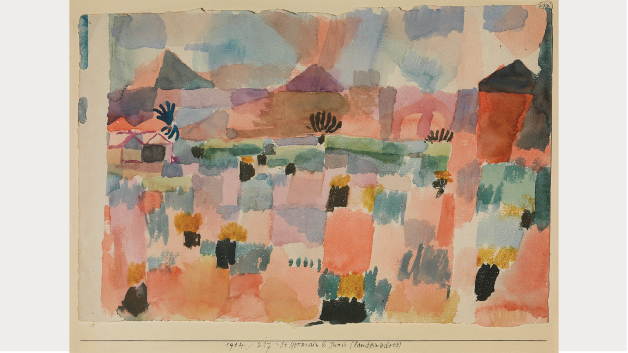 لوحة سان جرمان قرب تونس (نحو الداخل)، بول كلي، تونس عام 1914 م؛ حيث تحوّّل المشهد الطبيعي إلى مساحات لونية مجرّّدة تعكس أثر الرحلة في رؤية الفنان، لا وصف المكان فحسب.