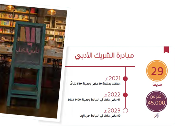 وإذا نظرنا إلى الحراك الأدبي بكافة مجالاته المتنوعة وفضاءاته، فسنجد تغيرات جذرية طرأت على المشهد برمّته. فالوزارة، عبر هيئة الأدب والنشر والترجمة، تحاول أن تفتح المساحات للجمعيات والمؤسسات الخاصة لتقوم بممارسة الأنشطة الثقافية، وتتولى هي دور الإشراف والتنظيم والتحفيز. ولو أخذنا مبادرة واحدة من مبادرات الهيئة، وهي مبادرة “الشريك الأدبي”، التي تسعى لتفعيل دور المقاهي وتحويلها إلى منصات لإقامة الفعاليات الثقافية المتنوعة من أمسيات وندوات وحوارات، لوجدنا أن عدد المقاهي المنضوية تحت مظلة المبادرة في تزايد مستمر، وكذلك عدد الأنشطة التي مورست فيها؛ إذ زاد عدد المقاهي ليصل إلى 80 مقهى هذا العام مقارنة بـ45 مقهى للعام المنصرم.