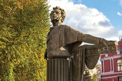 على مدخل المتحف الروسي، في قلب ساحة الفنون، يقف شامخاً، حارساً لكنوز المكان، ماداً ذراعيه كمن ينشد قصائده، مرحباً بالزوار القادمين من شتى جهات الأرض، ومخبئاً الحمائم في قلبه وعلى سفوح يديه.