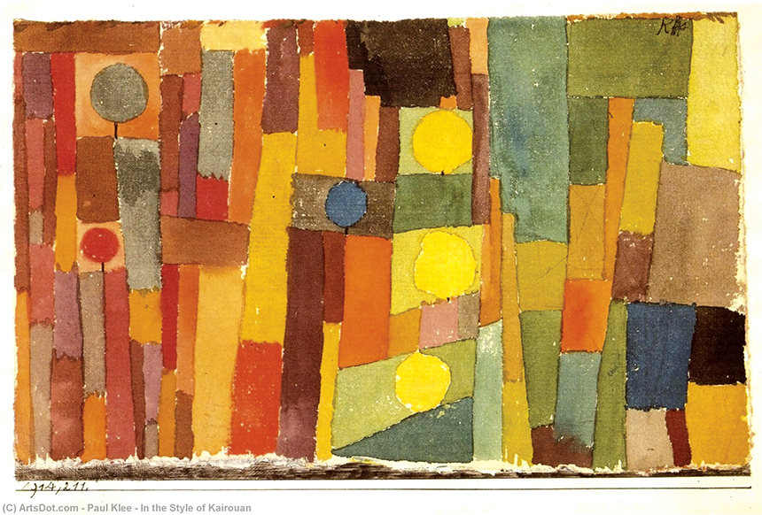 تتألف هذه اللوحة من مجموعة مستطيلات بسيطة مختلفة المقاسات وبعض الدوائر. ومن المرجّح أن تراصّ هذه المستطيلات مستوحى من تراصِّ الأبنية التي شاهدها في القيروان، وأن تكون الدوائر مستوحاة من القباب التي ترصّع خط الأفق في المدينة الإسلامية. ولكن أهمية الاستيحاء لم تعد تكمن في أسلوب تصوير المدينة، بل في الوصول إلى لغة لونية قائمة بحد ذاتها بغض النظر عن مصدرها.