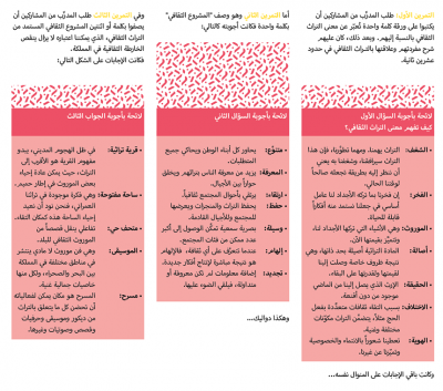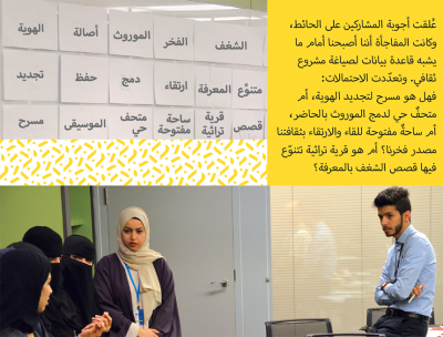 ومن ثم طلب المدرِّب من المشاركين أن يعرِّفوا التراث بكلمة واحدة وكيف يفهمونه. فكانت إجابات المشاركين مختلفة عن بعضها بعضاً، لكنها عبّرت عن القيم التي يرونها في التراث أكثر مما كانت تعريفاً به. إذ تحدّثت إحدى المشاركات عن ماهية الشغف بالتراث بقولها: “إنه ما يجعلنا ننظر إلى التراث بطريقة تجعله متناغماً مع عصرنا الحالي”، بينما عرَّفت أخرى التـراث الثقافي على أنه الهوية التي “تمنحنا الشعور بالانتماء والخصوصية، وتميّزنا عن غيرنا”.