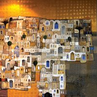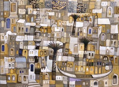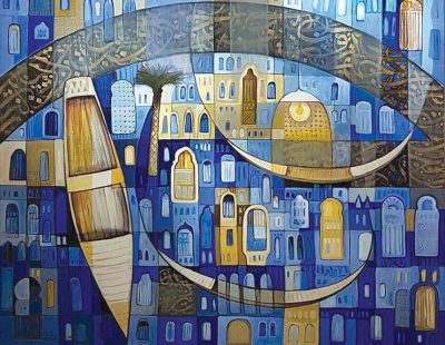 في مرحلة سابقة، تركَّزت أعماله على استلهام المشغولات الزخرفية في العناصر الخشبية بالعمارة الشعبية: الأبواب والشبابيك والمرزع (العمود الدائم)، وبفن القط أيضاً. ولكنها اتخذت طابعاً خاصاً تحاكي فيه تفاصيل أخرى من التراث العربي والإسلامي، مستقاة من الزخارف وتشكيلات الحروف العربية ومآذن المساجد، ما يشير إلى نزعة روحية أصيلة مستقرة في وجدانه، تتضح بشكل خاص في رسمه دائماً الكعبة المشرَّفة بحالة من الوجد، تحيط بها موتيفات جمالية تهتف بقداستها.