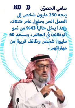 وتوقَّع الحصيّن أن يتجه 230 مليون شخص إلى العمل الحر بحلول عام 2025، وسيجد 60 مليون شخص وظائف قريبة من مهاراتهم. فإحدى المشكلات الموجودة الآن هي أن نسبة كبيرة من خريجي الجامعات لا يجدون وظائف تناسب تخصصهم، فيهدر ذلك خمس سنوات من أعمارهم ثم يعملون بتخصص مختلف! كما أن 200 مليون شخص من الموظفين حالياً في عمل جزئي ستكون لهم فرص عمل في المستقبل. وهذا النمو في التوجه إلى العمل الحرّ وصل حالياً %43 من وظائف العالم، ويتوقع أن تصل إلى %50 بحلول عام 2020م في الدول المتقدِّمة.