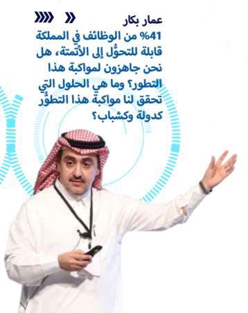 “في المملكة، واستناداً إلى دراسة أعدتها مؤسسة “ماكنزي”، فإن %41 من الوظائف الموجودة قابلة للتحوُّل إلى الأتمتة من ناحية نظرية. أما من الناحية العملية، فنحن بحاجة إلى الاستثمار في التقنية وتجهيز البنية التحتية واحتساب التكلفة ومدى توافر المبرمجين والمتخصصين في هذا المجال.. إلخ. بمعنى أنه كلما تقدَّمت الشركات في مجال التقنية، فإن البعض من هؤلاء الـ %41 من الأشخاص سوف يفقدون وظائفهم”. بهذه الملاحظة، بدأ الرئيس التنفيذي لمجموعة يس تو ديجيتال ومركز مقاربة الأبحاث الدكتور عمار بكار حديثه، وتساءل: هل نحن جاهزون لمواكبة هذا التطور؟ وما هي الحلول التي تحقق لنا مواكبة هذا التطور على مستوى المملكة، كدولة وكشباب باحثين عن الفرص الأفضل في حياتهم العملية والشخصية.