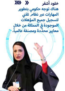 أما المديرة التنفيذية للإطار الوطني للمؤهلات بهيئة تقويم التعليم والتدريب الدكتورة خلود أشقر فتحدثت عن التوجه الحكومي لتطوير المهارات، وأعلنت عن وجود نظام تقني في هيئة تقويم التعليم والتدريب لتسجيل جميع المؤهلات الموجودة في المملكة، التي تم بناؤها من خلال معايير محدَّدة ومصنَّفة عالمياً، وحقنها بمهارات وجدارات في منظومة تقنية تمكّن أصحاب العمل، الطلاب، وأولياء الأمور من أن يدخلوا إلى الموقع الإلكتروني للاطلاع على المؤهلات المُعترف بها على المستوى الوطني.