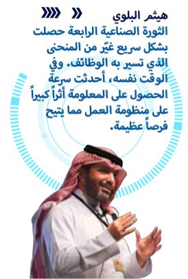 بعد ذلك، تحدث المستشار في الموارد البشرية في أرامكو السعودية المهندس هيثم البلوي عن الثورة الصناعية الرابعة التي نعيشها. وقال: “إن هذه الثورة حصلت بشكل سريع غيّر من المنحنى الذي تسير به الوظائف. وفي الوقت نفسه، أحدثت سرعة الحصول على المعلومة أثراً كبيراً، فتغيرت منظومة العمل بسبب سرعة الوصول إلى المعلومة، وهذا ما منح العالم معلومات لم يكن يحلم بالحصول عليها سابقاً. وأصبحت المعلومات عن الشيء أو الشخص تتكوَّن بلا حدود، وتتدفَّق من جميع الاتجاهات. مما يتيح فرصاً عظيمة في هذه الثورة الصناعية.