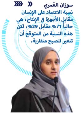 وذكرت أن الدراسة أشارت إلى أن نسبة الاعتماد على الإنسان مقابل الأجهزة في الإنتاج، هي حالياً %71 مقابل %29 على التوالي. لكن الدراسة تتوقَّع تغيُّر هذه النسبة على المدى القريب لتصبح بنسب متقاربة، بمعنى أن معدَّل الاستخدام للعامل البشري والأجهزة سيكون بنسب متساوية في المستقبل القريب.