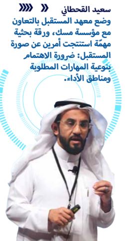 استناداً إلى ما توقَّع “معهد المستقبل” (IFTF) قبل 10 سنوات أن يحدث اليوم، انطلق قائد التعلُّم والتطوير العالمي في شركة سابك الأستاذ سعيد القحطاني في حديثه، مؤكداً أنهم توقَّعوا كل شيء تقريباً من أوبر إلى نيتفليكس، حين لم يكن أحد ينظر في ذلك أو يأخذه على محمل الجد. وقال: “لقد وضع المعهد بالتعاون مع مؤسسة مسك، ورقة بحثية مهمّة استنتجت أمرين عن صورة المستقبل، هي نوعية المهارات المطلوبة ومناطق الأداء، التي تمثل:
