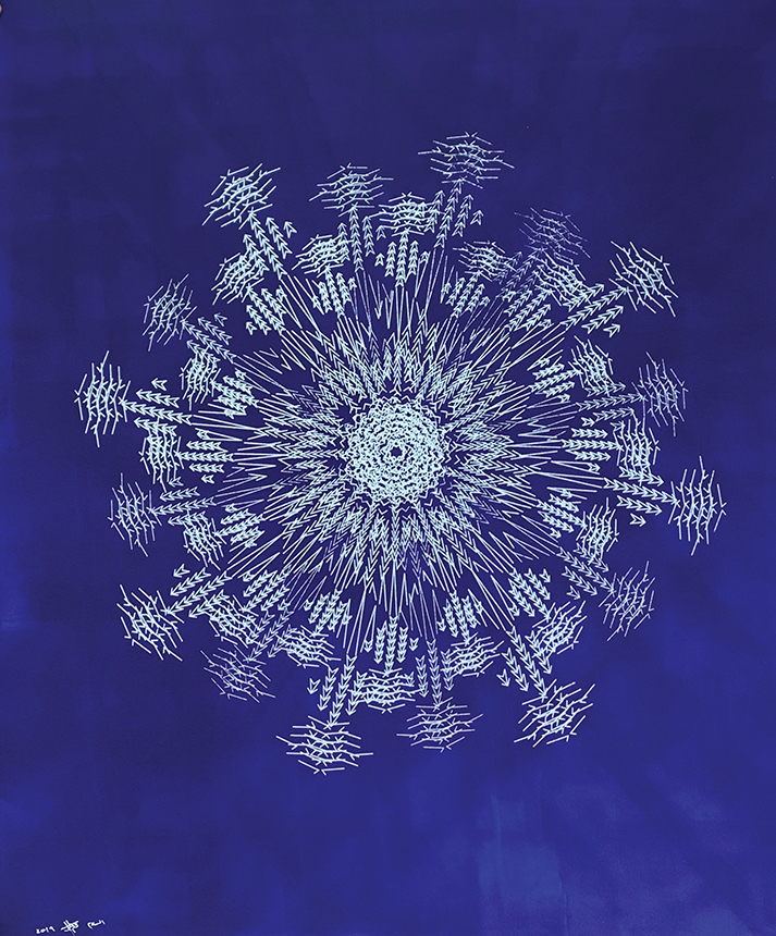 ولا بد لمن يتأمل في أعمال الحمود من أن يثير مسألة تكرار العناصر الجمالية في أعمالها، كما هو الحال أمام عملها الكبير “الكيان والوجود”. وحول وظيفة هذا التكرار تقول الفنانة: “لقد تفهمت ماهية التكرار من دون رتابة ونمو أعداده بلا حدود، ولكن مع تباينات بنسب تكميلية.. لهذا لم أكرِّر أو أستنسخ التصاميم التي قام بها الفنانون المسلمون منذ قرون سابقة، لكنني بدلاً من ذلك استخدمت معادلة رياضية معقَّدة تعتمد على مزيج من اللغة العربية المكتوبة والهندسة التحليلية والفراغية، ومن دون شك فإن اللغة العربية هي واحدة من أكبر الملهمات في الفن”.