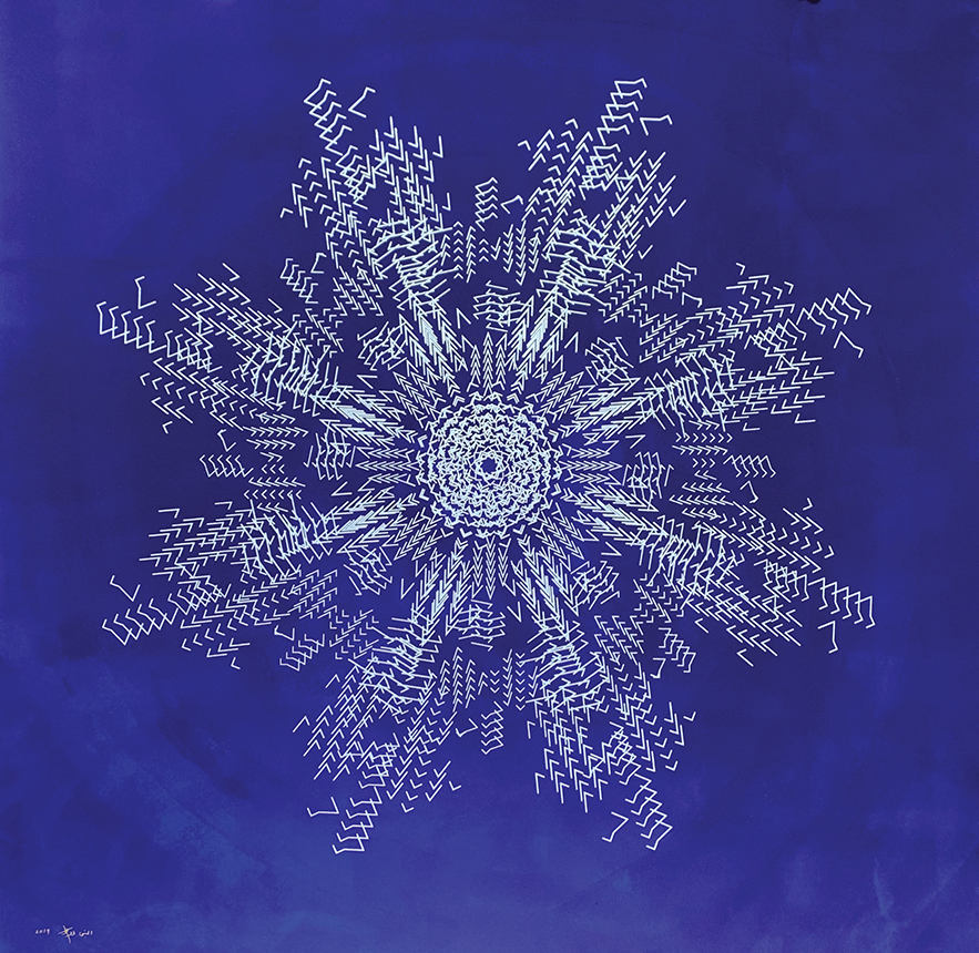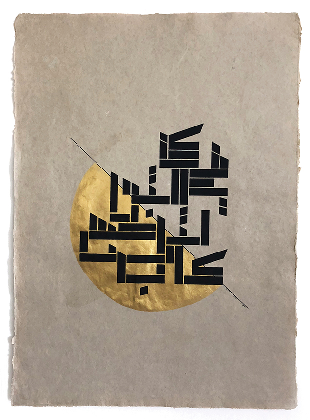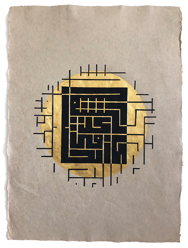 وبموازاة استلهام الأنماط والأشكال الزخرفية الإسلامية، ثَمَّة حضور واضح للخط العربي في بعض اللوحات المجردة، يتأرجح ما بين التقاليد الكلاسيكية والرؤية المعاصرة، من دون الجزم بانحياز الفنانة إلى أحدهما أكثر من الآخر.