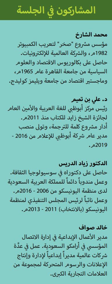 “في عصر وسائل النشر والتواصل الرقمية تثبت اللغة العربية مجدداً أنها قادرة على خدمة المستخدم العربي. ولكن لا يزال هذا المستخدم ينتظر تطبيق كثير من الأفكار التي تجمع اللغة العربية بالتقنية، وتجعله يبدع بلغته وسط هذا المحتوى الرقمي، مثلما يفعل أبناء بعض اللغات الأخرى الغربية والشرقية”. هذه الملاحظة التي أبداها رئيس تحرير القافلة ومضيف الجلسة الأستاذ بندر الحربي كانت العنوان العريض للنقاش في هذه الجلسة التي تناولت ملامح عن بعض جوانب هذه القضية.