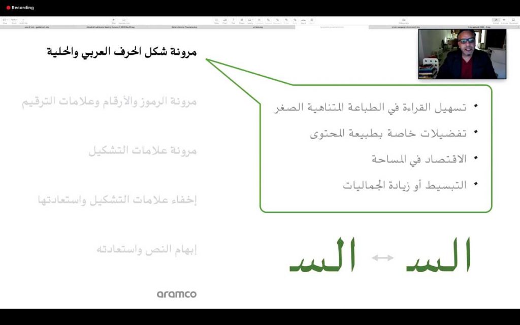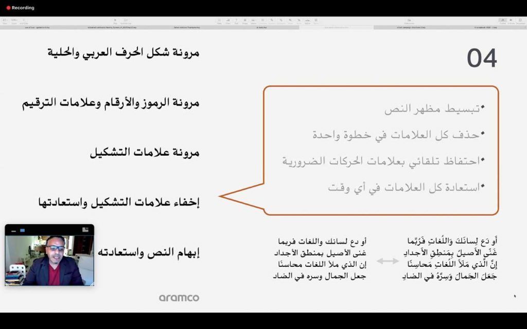 وجدنا في أرامكو حلولاً مبتكرة للخطوط العربية، منها: مرونة شكل الحرف العربي، ومرونة الرموز والأرقام وعلامات الترقيم، إضافة إلى إخفاء علامات التشكيل واستعادتها، وإبهام النص واستعادته.
