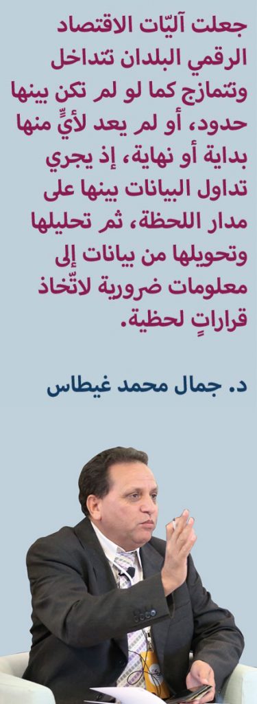وأوضح إن آليّات الاقتصاد الرقمي جعلت البلدان تتداخل وتتمازج كما لو لم يعد بينها حدود، أو لم يعد لأيٍّ منها بداية أو نهاية، إذ يجري تداول البيانات بينها على مدار اللحظة، ثم تحليلها وتحويلها من بيانات إلى معلومات ضرورية لاتّخاذ قراراتٍ فعلية ولحظية. وإن للاقتصاد الرقمي مسارات رئيسة يدور فيها، أحدها يتعلق برؤية الحكومات وخططها الاستراتيجية، ومسار آخر يتعلق بالقطاع الخاص، ومسار ثالث يتعلق بالوضع التنظيمي والقانوني، ثم مسار يتعلق بأوضاع البنية التحتية.