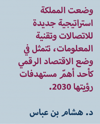وقال بن عباس إن المملكة وضعت استراتيجية جديدة للاتصالات وتقنية المعلومات تتمثل في وضع الاقتصاد الرقمي كأحد أهمّ مستهدفات رؤية المملكة 2030، كما يتوقّع خلال السنوات القادمة أن تكون هنالك نقلة كبيرة جداً تغيِّر نماذج الأعمال الحالية.