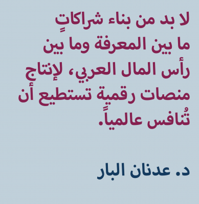 - العلاقات مع الشركات الأخرى: في الاقتصاد التقليدي يكون الأداء منفرداً، بينما في الاقتصاد الرقمي غالباً ما تتعاون الجهات. وأضاف البار أن المفهوم الأساسي للتجارة الإلكترونية هو بيع وشراء السلع عبر منصَّات إلكترونية. أما الآن فقد توسّعت هذه التجارة لتشمل خدمات رقمية؛ ليس فيها سِلع وتُباع وتُشترى عبر الإنترنت. وشدَّد على أننا لسنا في عصر الانغلاق والتحجيم، فلا بد من أن ننفتح ونُمكّن الشباب، وأن نعيد التفكير في البنية التشريعية وبنية التجارة في دولنا لنتمكّن من اللحاق بالرّكب، فالبنية التحتية للتقنية تحتاج إلى دعم كبير جداً في كثير من بلداننا العربية، ولا بد من بناء شراكاتٍ ما بين المعرفة وما بين رأس المال العربي، لإنتاج منصات رقمية تستطيع أن تُنافس عالمياً.