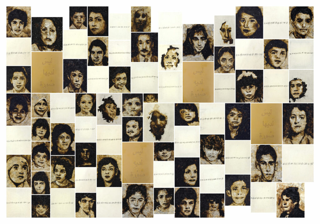في عملها هذا استخدمت الطريقة المذكورة آنفاً، وهي حرق القماش الخام بدرجات متفاوتة لتشكل بها الوجوه بواسطة التدرجات اللونية. وإضافة إلى ذلك، استعانت الفنانة بالتقنيات الحديثة، وأشركت برامج الذكاء الاصطناعي لخلق وجوه مفترضة بعد إدخال المعلومات الشخصية للضحية، التي من خلالها سوف يشكِّل وجهاً مفترضاً لهذا الشخص. فهذه الوجوه التي رافقت هناء في عملها كانت كما تروي الفنانة بمثابة وجوه حيّة، كانت عيونهم تلاحقها في محترفها الفني أثناء العمل. وفي الوجوه التي أحيتها هناء، ثَمَّة براعة في إقامة حوار ما بين الضحية والمشاهد، وفي استثارة المخيلة لخلق حالة معنوية ثلاثية الأبعاد.