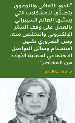وشدَّدت مروة على أهمية الدور الثقافي للأسرة في تجنيب أولادهم التعرُّض للتنمُّر الإلكتروني من خلال الحوار الدائم معهم، والتحقق من سلوكهم، ومراقبتهم في كيفية استخدامهم للإنترنت ووسائل التواصل الاجتماعي، وضرورة تقنين استخدام الإنترنت وتخصيص أوقات محدَّدة لها، لحمايتهم من الإدمان والمخاطر. بعض الأمهات يتسببن في تعرض أولادهن للخطر والتنمُّر الإلكتروني إما لنقص حقيقي في المعرفة بهذه المشكلة، أو لانشغالهن في العمل.