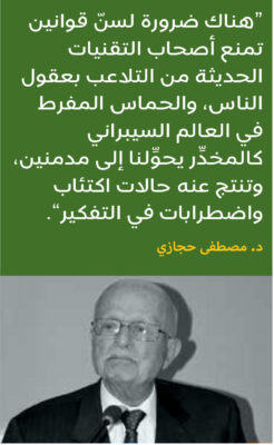 كان الدكتور مصطفى حجازي أول المتحدثين، وبدأ كلمته منوِّهاً بأهمية طرح هذه المسألة للبحث، قائلاً: “إن هذا اللقاء يأتي في وقته المناسب. فنحن بحاجة إلى مثل هذه الندوات واللقاءات التي تُناقش قضية التأثير السيبراني؛ لأننا منخرطون في هذا المجال، ونتنافس في استخدامه بفرح، ولكننا لا نعرف وجهه المظلم”.