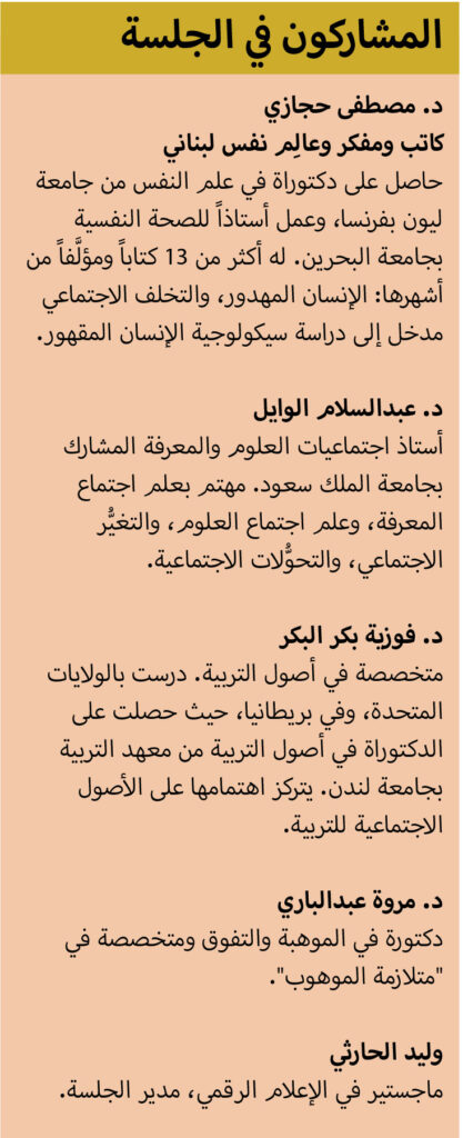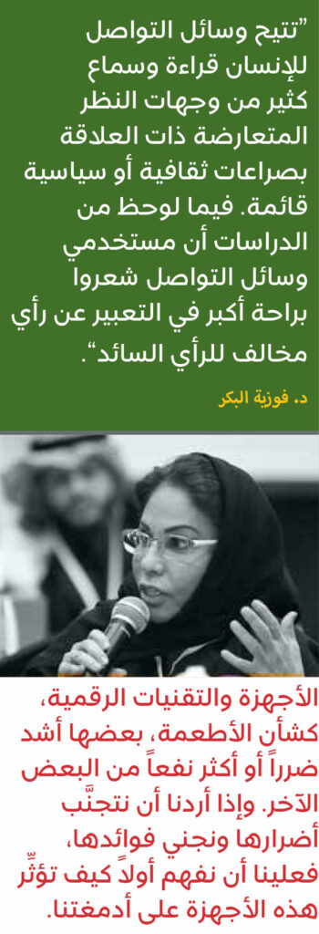 ولاحظوا أن وسائل التواصل الاجتماعي كسرت القوالب الفوقية، وغيَّرت السلطة الاجتماعية، وأتاحت المجال لإفلات الجيل الجديد من سيطرة جيل الكبار والتحرُّر من المرجعية الماضوية. “إلا أننا يجب أن نعي الجوانب الخفية حتى نحسن استخدام هذه التقنيات والتحكم بها بكل مناعة وقدرة ولا نكون أدوات لها”.