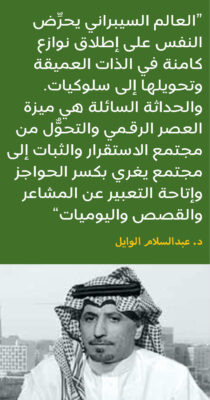 وأضاف الوايل أن عالِم النفس جون سويلر، وهو أحد كبار دارسي تأثير السيبرانية على السلوك، طرح مفهوماً جديداً، هو “تأثير عدم التحفظ على الهواء”. وقد أصبح هذا المفهوم شائعاً على نطاق واسع في أوساط الأكاديميين المختصين بهذا المجال. فعلى سبيل المثال إذا كنت في الحافلة لا تستطيع أن تُخبر أي غريب تقابله وجهاً لوجه بخصوصياتك وآرائك وهواياتك. ولكن بمجرد أن تجلس في غرفتك وتدخل إلى فيسبوك أو تويتر أو سنابشات تُخبر ملايين الغرباء عن خصوصياتك ومشاعرك وسلوكياتك بسبب تأثيرات عدم الإحساس بالتحفظ على الهواء. فهذا العالم السيبراني يغري بتكسير الحواجز وإتاحة الفرصة للتعبير عن المشاعر والقصص واليوميات.