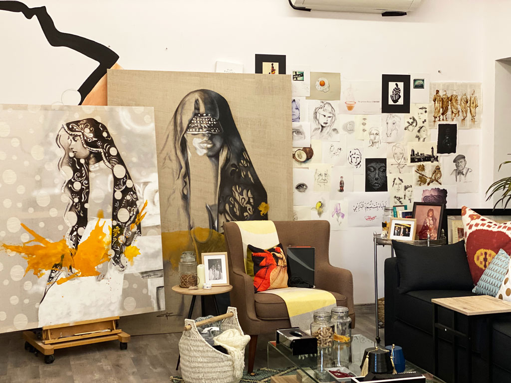 يدفعنا حديث الفنانة عن الرسم على صوت الشعر والموسيقى إلى التوقف أمام مرسمها، حيث يشعر الزائر بدفء التعامل مع المكان، علماً أن مرسمها ليس مجلساً مفتوحاً للعابرين والفضوليين. إنه المرسم الثالث للفنانة التي تقول عنه: “هو عالمي حيث أقضي معظم أوقاتي فيه، فجزء كبير من حياتي يدور داخل هذا المكان الذي أصبح يمثلني بكل ما تحمله الكلمة من معنى. فمنذ دخول الشخص من عتبة الباب يستنشق رائحة القهوة والأوراق والخشب والمواد الفنية، وتشد عينيه تلك الألوان واللوح والأوراق المعلقة على الجدران، ويمكنه أن يلاحظ تطوُّرات أعمالي ويعيش معي أفكاري”. وتضيف: “مرسمي هو منزلي الصغير الذي أستقبل فيه الزوار وأتبادل مع نفسي ولوحاتي الحوار. فهذا المكان يشعرني بالدفء والراحة، ويشعل حماستي للقيام بكل ما هو مميز وجديد”.