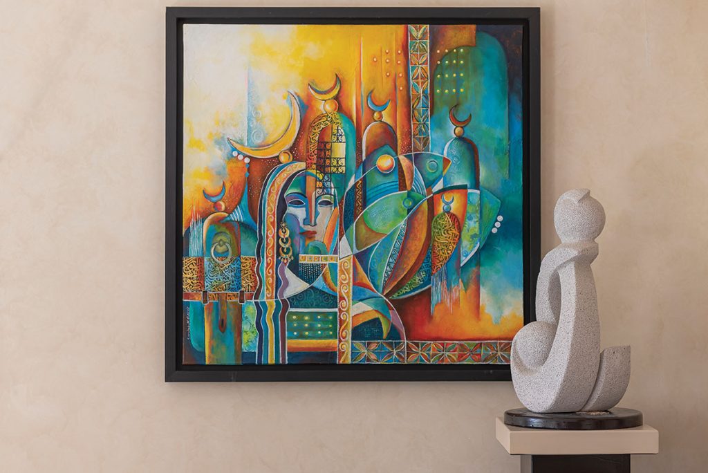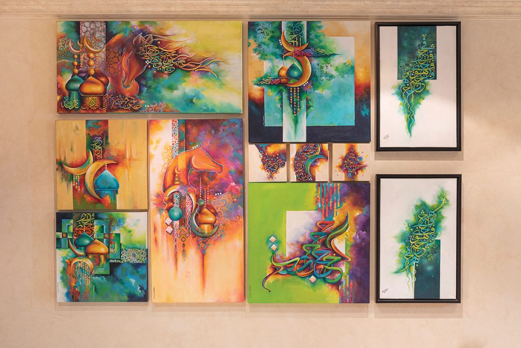 قدَّمت الشافعي من خلال معرضها الشخصي الأول، ما يقرب من 33 لوحة فنية، وسمَّته “مقامات”، وأشارت في حديثها للقافلة إلى أن الاسم فرض نفسه تلقائياً مع التجربة والفكرة، وأضافت “لطالما انتابني ذات الإحساس عندما أقف أمام اللوحة الحروفية أو اللوحة التشكيلية، فكلتاهما معزوفتان وإن اختلفت أدواتهما، فهما تتشاركان ذات الإيقاع الموسيقي، فالخط بحركاته الانسيابية الرشيقة ما بين الصعود والنزول والالتفاف والسكون، واللون بتدرجاته السلسة تارة والصاخبة تارة أخرى بين مقاماته الباردة والدافئة، يشكلان معاً إيقاعاً موسيقياً بصرياً، ربما صامتاً، ولكن تطرب له العين والروح”.