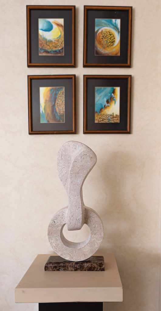 وأضافت “في العام 2011م قررت التوقف عن المشاركة بأعمال النحت، بعد أن لاحظت أن الأعمال تعود إليّ مكسورة أو متضررة، إذ كانت المادة المستخدمة آنذاك الحجر الصناعي، وهو حجر هش قابل للكسر، ولكنه كان المتوفر في ذلك الوقت، فارتأيت أن أتوقف إلى حين إيجاد مواد أكثر متانة وصلابة، إلى أن عدت قبل أربع سنوات بجهد مكثف للتعويض عما فات”.