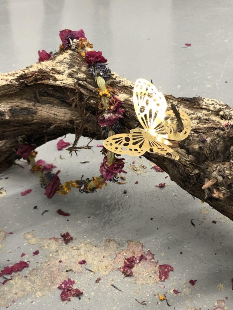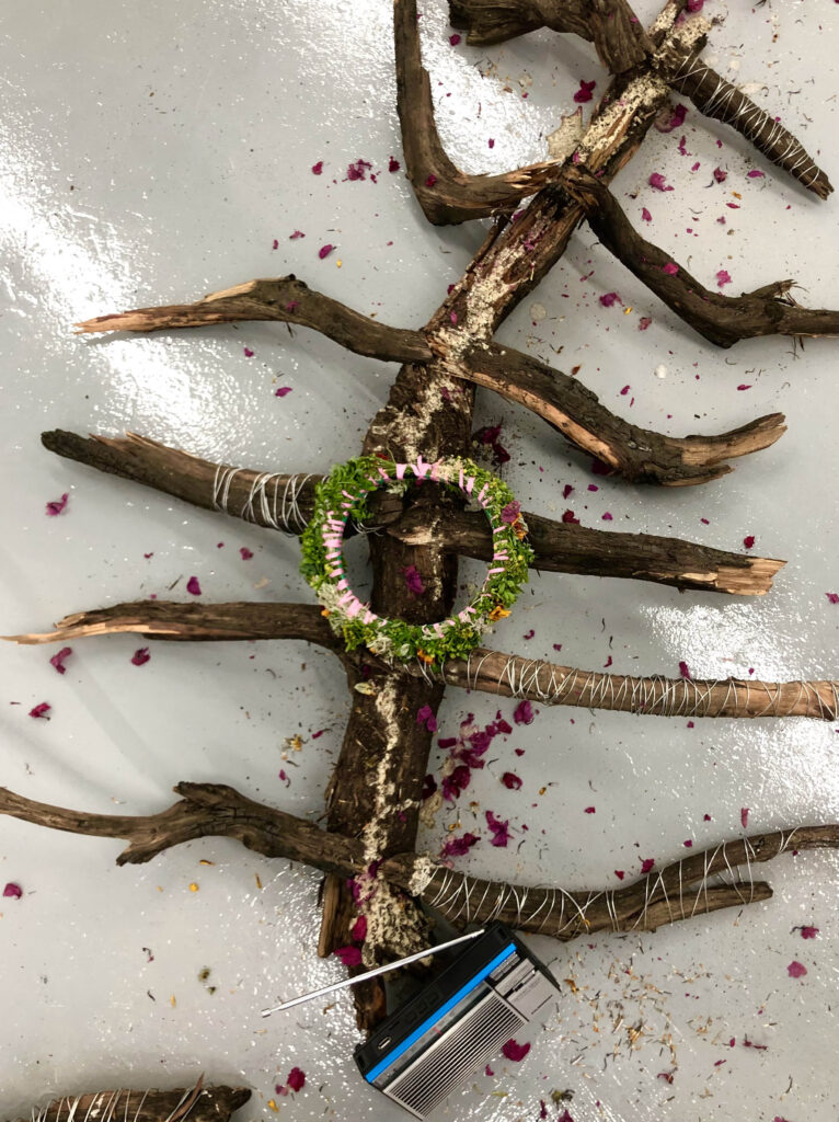 ويوجد مستوى آخر من المجاورة في محاذاة التركيب الفني ثلاثي الأبعاد والنص الشعري المخطوط بالفحم إلى جواره في أرضية المعرض. يؤدي وجودُ التنصيب والنص جنبًا إلى جنب وظيفةً شديدة الأهمية متعلقة بأيديولوجيا العمل البيئية. ويشير التجاور بين الطبيعي والثقافي إلى دور الإنسان المزدوج، التدميري والترميمي، في البيئة.