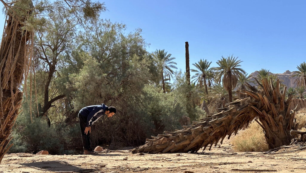 بهذه الطريقة يضع الفرج متلقِّيه في تحدٍّ يتعلق بتحديد ماهيَّة العمل الفني ومسؤولية إعادة رسم حدوده على الدوام. ويمكن القول إن هذا الملمح يشكِّل الركيزة النظرية التي تقوم عليها ممارسة الفرج الفنية. ولتلك الممارسة ثلاثة جوانب متصلة، وهي المُجاورة بين أشكال التعبير والمواد أو الخامات والأساليب المتنافرة ظاهريًا، وثانيًا اعتماد مفهوم اللعب لا باعتباره نشاطًا وظيفيًا وإنما موقف وتجربة ذات مغزى في حدِّ ذاتها، وثالثًا تسخير الجسم لمستويات أدائية يتراوح بينها بسهولة ومرونة: طبيعية وطقوسية وفنية. وتشكِّل هذه الجوانب مجتمعة معالمَ تجربة الفرج، وتحقق أولوية العملية الفنية على حساب العمل الفني المنجَز. ولكي نفصِّل هذه الجوانب سنعرض بعضًا من أعمال الفرج الفنية التي تستثمر واحدًا من أبرز “موتيفاته” حضورًا، وهي “أكراب النخل الجافة”.