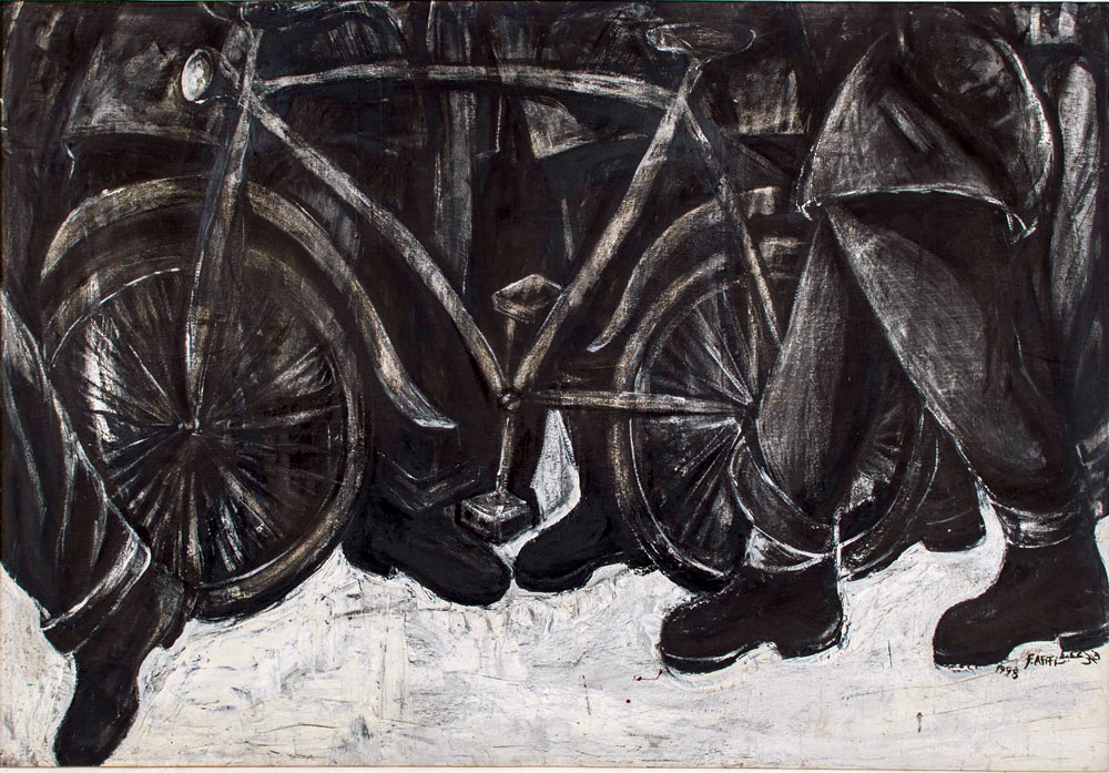 “ما حكاية الدرَّاجة معك؟!”، فقال ضاحكًا: “حينما عملت في المصنع الحربي منحوني درَّاجة مثل غيري من العمَّال، توفيرًا لنفقات المواصلات. كنت أستقلها كلَّ صباح من بيتي في السيدة زينب إلى المصنع على كورنيش المعادي، وبالعكس، فصارت جزءًا مني، وأيضًا جزءًا من لوحاتي. كأن الإنسان يولد بدرَّاجة”.