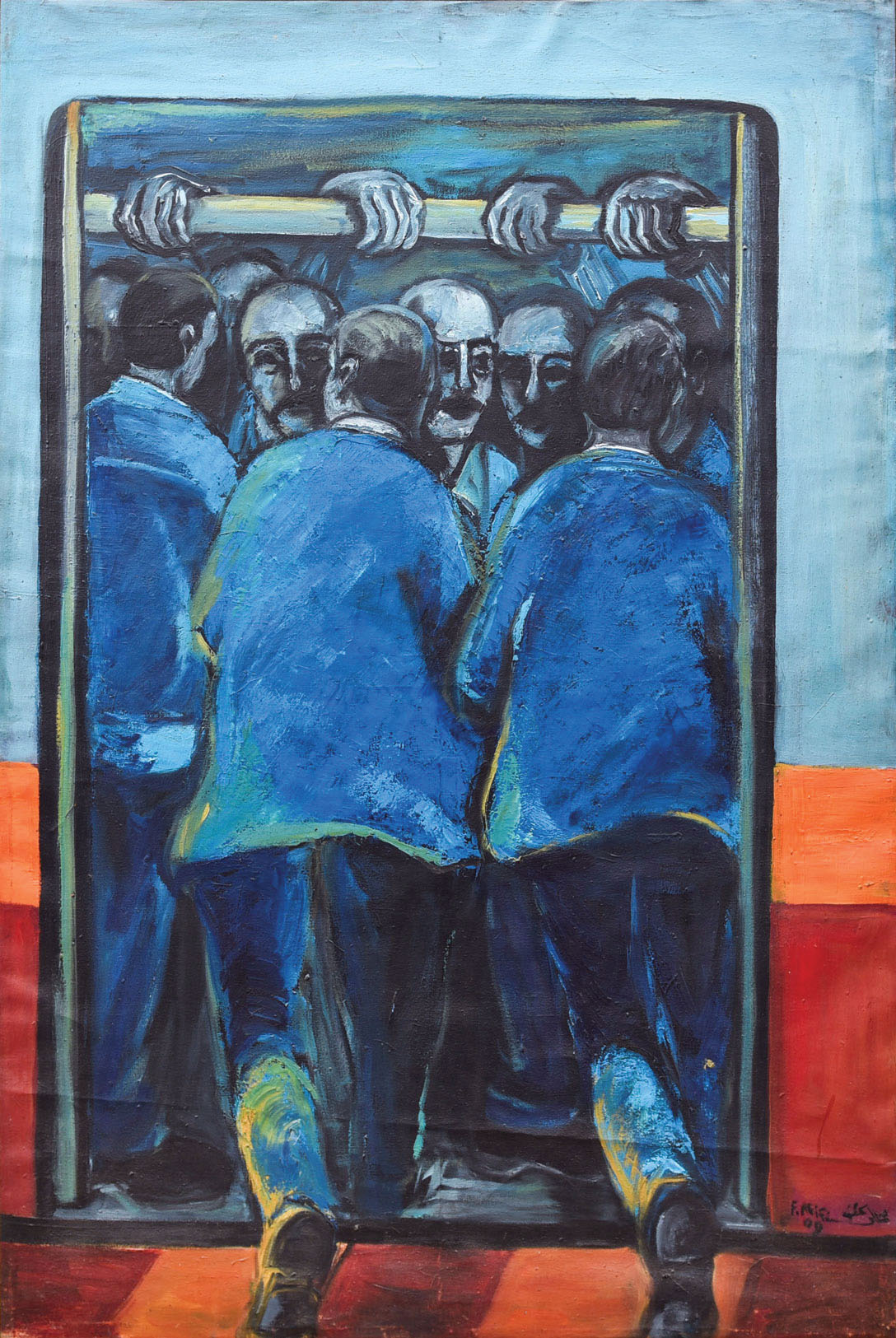 أول صدمة تلقَّاها حين التحق بالمصنع أنهم قالوا له: “اِنسَ اسمك. أنت مجرد رقم، رقمك أهم من اسمك”. يقول: “وجدت العلاقة معقدة مع المديرين، لكنها جميلة جدًا مع الزملاء. التكافل الاجتماعي بيننا كان ممتازًا. وقد طلبت منهم أن يهجموا على “الأتيليه” ليحضروا أول معرض لي عام 1982م، وكان عنوانه “شعبيات”. قلت لهم: أريد المصنع بالكامل هناك، أريد المثقفين أن يشعروا بأن لي جمهورًا عريضًا. فجاؤوا على بَكْرة أبيهم، مهندسين وعمالًا، وسدُّوا عين الشمس”.