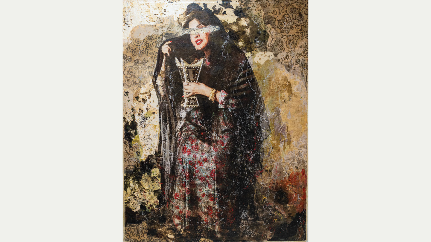 في اشتغالات النمر يتجلى حضور المرأة محورًا مركزيًّا مُشبَعًا بأشكال الهوية وطبقات التراث؛ إذ يُصبح الجسد الأيقوني بؤرةً للحكايات والزخارف وفضاءً لإعادة إنتاج المعنى مع كل عمل فني جديد. وغالبًا ما تبدو المرأة في لوحاتها محجوبةَ العينين أو تغطي إحداهما قصدًا، في حين تنشغل اليد بحمل أدوات وعناصر تراثية، في إيماءة تضعها بين ثنائية الهشاشة والقوة، وبين الصمت المليء بالدلالات والكلام المؤجل في انتظار لحظة البوح.