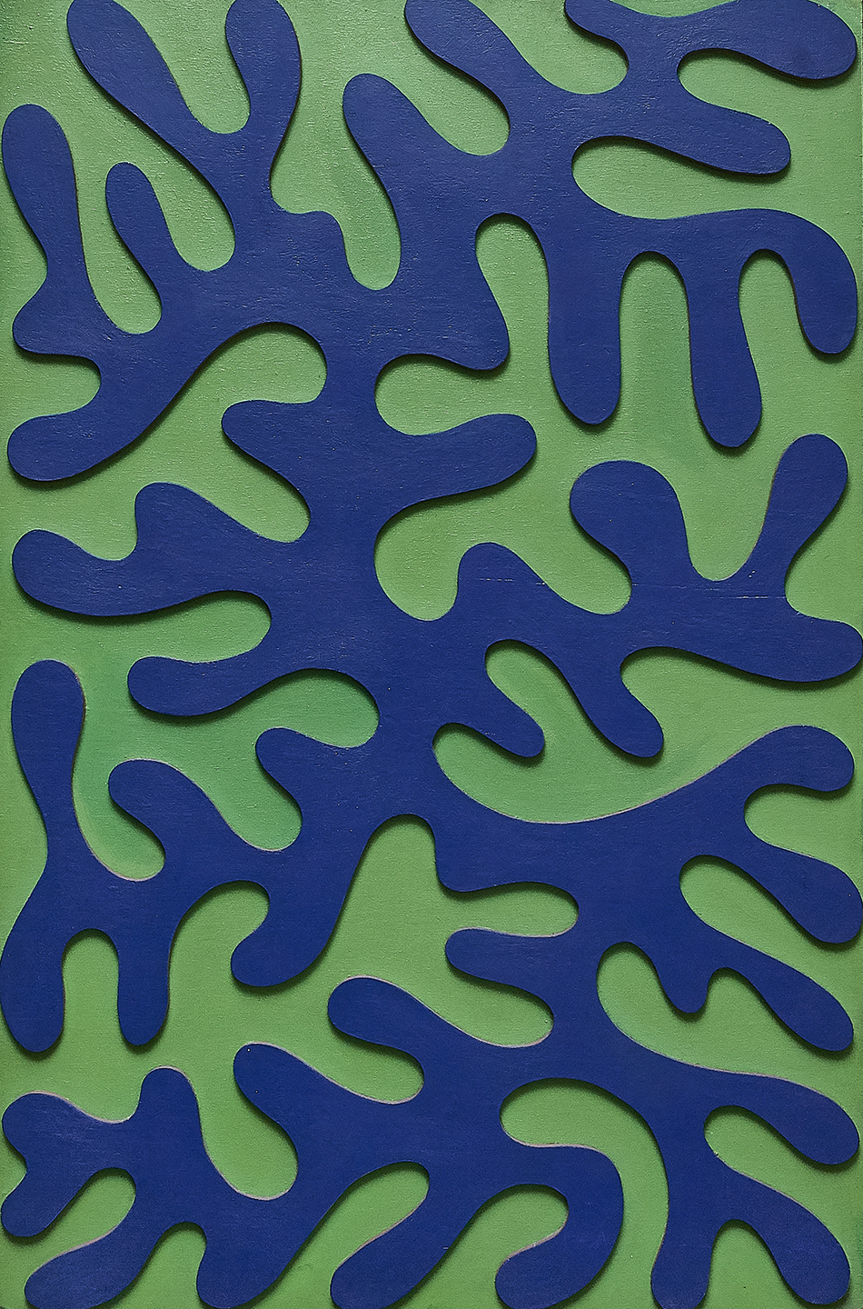 لوحتان: الأول لـ مليكة أكزناي، الطحلب الأزرق، ١٩٦٨. تكوين بارز وأكريليك على خشب، ١٠٠ × ٦٥ سم.
