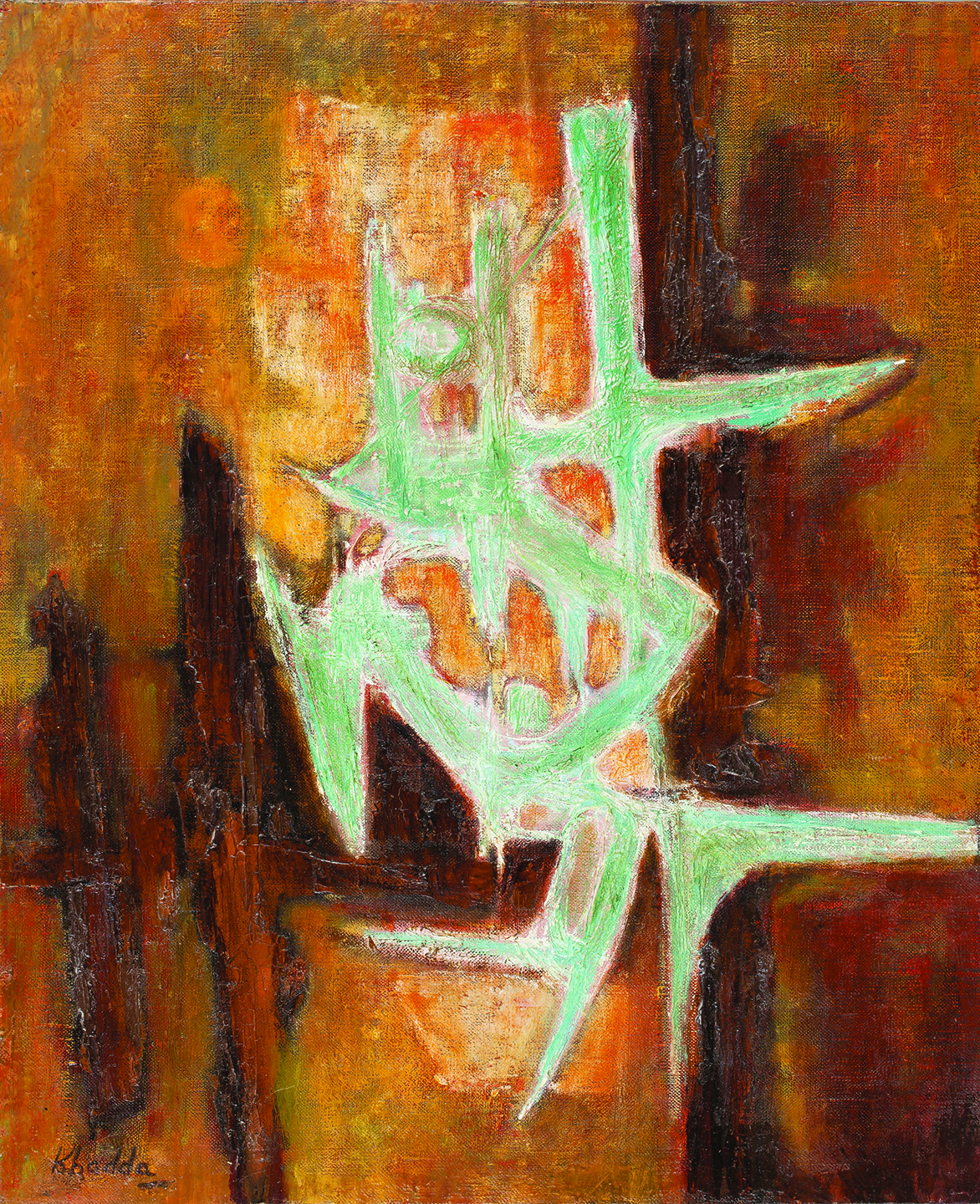 بإذن من مؤسسة بارجيل للفنون، الشارقة. والثانية لـ محمد خدة، تجريد أخضر، ١٩٦٩. ألوان زيتية على قماش، ٥٤ × ٤٥ سم بإذن من مؤسسة بارجيل للفنون، الشارقة