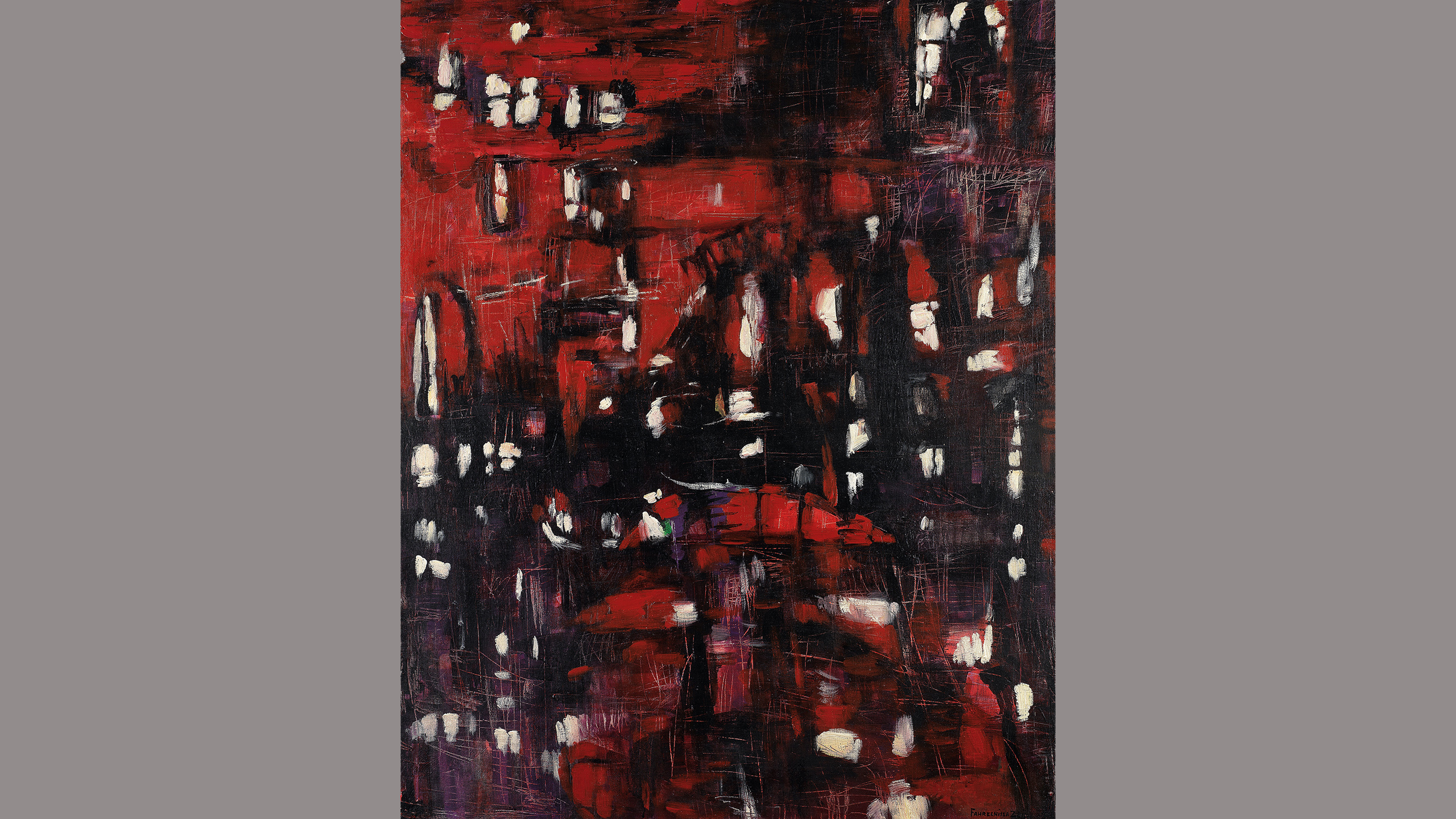 فخر النساء زيد، المدينة الحمراء، ١٩٥٧. ألوان زيتية على قماش، ١٦٢ × ١٣٢ سم. بإذن من مؤسسة بارجيل للفنون، الشارقة.