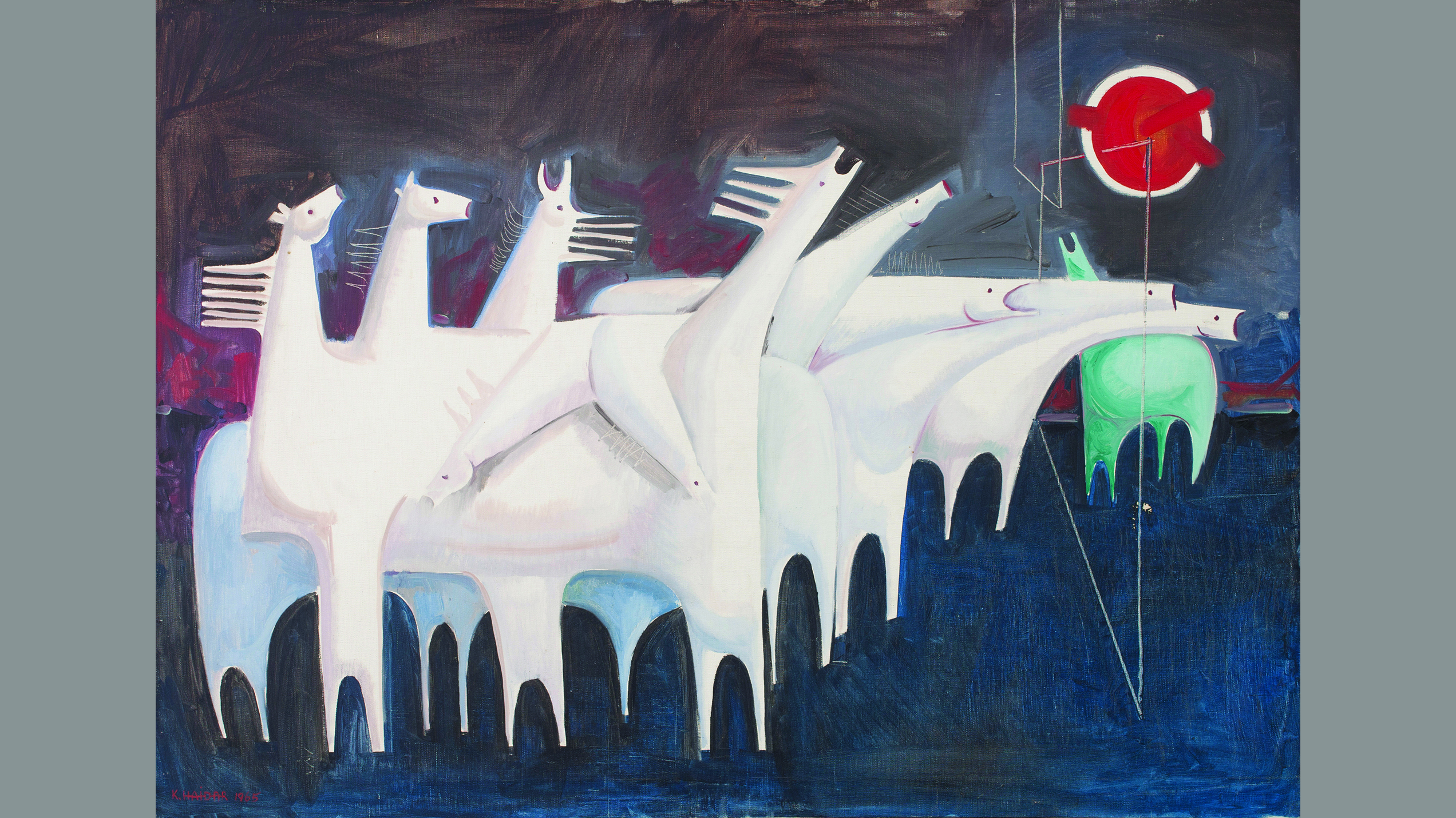 كاظم حيدر، عشرة خيول متعبة تتحاور مع العدم (ملحمة الشهيد)، ١٩٦٥ ألوان زيتية على قماش، ٩١ × ١٢٧ سم. بإذن من مؤسسة بارجيل للفنون، الشارقة