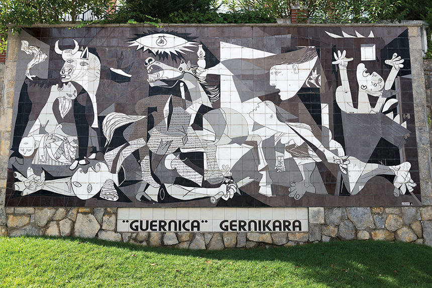 وقد تكون لوحة الفنان العالمي بابلو بيكاسو “غرنيكا” أشهر لوحة رُسمت في القرن العشرين من دون منافس قريب. فقد أسهمت هذه اللوحة في لفت أنظار العالم للحرب الأهلية الإسبانية خلال عام 1937م. وقد رسمها بيكاسو تأثراً بالمجزرة التي تسبَّبت بها الطائرات النازية الألمانية قبيل الحرب العالمية الثانية بالتواطؤ مع الجنرال الإسباني فرانشيسكو فرانكو. وقد نفَّذها بيكاسو بانفعال ساخط صادق ومتمرد وبلا ألوان، فقط بالأبيض والأسود والدرجات الرمادية المتفحمة، وبقياس جداري كبير امتد 349 سم طولاً و776 سم عرضاً.