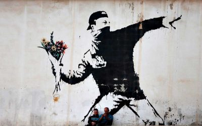 وبانكسي هو لقب فنان مجهول الهوية الحقيقية، يرجح البعض أن اسمه الحقيقي نيل بوكانان، ويقول آخرون إنه جامي هوليت، أو روبرت ديل ناجا. ولا يظهر هذا الفنان إلا في الظلام، ليرسم على جدار ما ما يريد، وغالباً باستخدام تقنية الطباعة الحريرية، التي تسمح له بمد قطعة مخرمة وفق رسم معيَّن، ورش الطلاء فوقها لتنطبع الصورة على الجدار. وكل ما سمح بتسريبه عن حياته الخاصة هو أنه بدأ يرسم في الرابعة عشرة من عمره بعدما طُرد من المدرسة، كما دخل السجن لفترة بسبب جنحة ما.