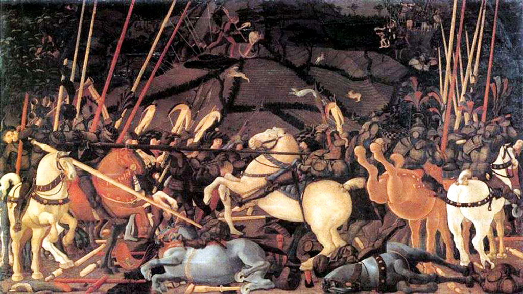 أما على مستوى المضمون، أي موضوع العمل الفني، فهناك أعمال في الفن الأوروبي استعان بها الفنان بالمسطرة (أو كاد) كي يرسم خطوطاً مستقيمة، حيث يستدعي الموضوع ذلك. ومن بواكير ذلك لوحة “معركة سان رومانو” لباولو أوتشيلو في القرن الخامس عشر، حيث تشكِّل الرماح مجموعة من الخطوط المستقيمة المتقاطعة تستمد قيمتها من خطابه الجمالي، وليس البطولي، وفي لوحةٍ لاحقة لدييغو بيلاسكويث، عنوانها “الرماح” أو “صلح بريدا”. صحيح أنّ “غابة” الرماح التي يمتشقها الجنود الحرّاس في اللّوحة الضخمة التي تمثّل المصالحة بين القوّات الإسبانية المحتلّة والهولنديّين الصاغرين المستسلمين، موجّهة إلى الأعلى في نوعٍ من الإقرار باستتباب السلم، لكنّها تمثّل ذلك التهديد الماثل. وعلى عكسها مثلاً، تلك البنادق التي يرفعها إلى جانب البيارق جنود الحرس البلدي، فيما يرسمهم الفنّان الهولندي رامبرانت في لوحته الكبرى “دورية الليل”، ثم “الخطوط” التي تُعبّر عن البيارق والبنادق، هي هنا خطوط طمأنةٍ لا خطوط تهديد بالتأكيد..