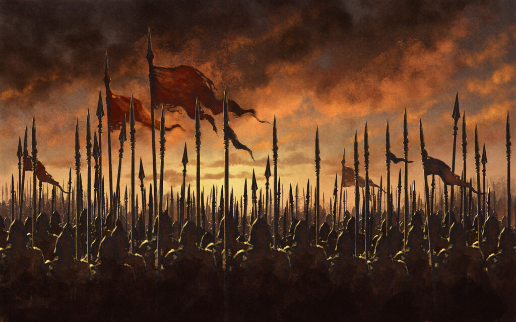 هكذا خاطب عمرو بن كلثوم ملكَ الحيرة عمرو بن هند، متحديًا ومباهيًا بشجاعة قومه ومنعتهم، مستخدمًا صورة رمزية كثيفة الدلالة، ليصف الرايات قبل المعركة وبعدها. فرايات قومه – بني تغلب- بيضاء اللون، ترفرف ناصعة بشموخ عندما تنزل الميدان. ولكنها تعود منه وقد اصطبغت بلون الدم حدّ ارتوائها.