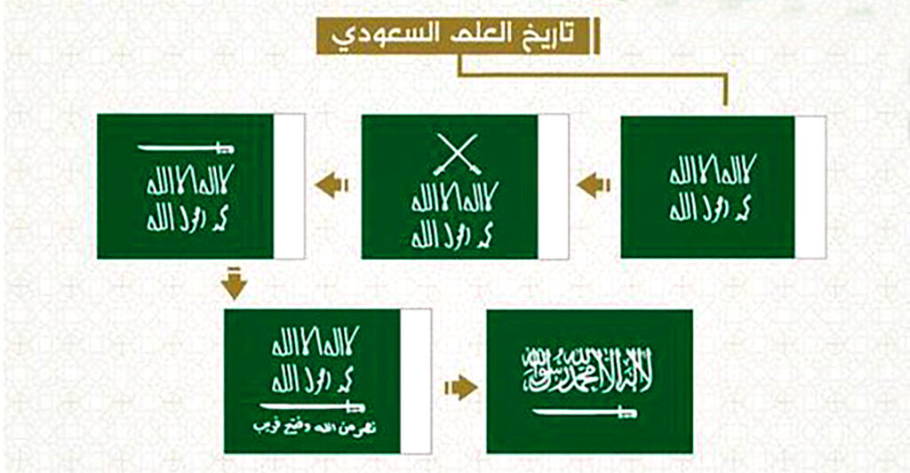 العَلَم السعودي متوارث من الدولة السعودية الأولى. فقد أتى في وصف أول راية سعودية رُفعت أنها “خضراء منسوجة من الخزّ والإبريسم، مكتوب عليها كلمة التوحيد، لا إله إلا الله محمد رسول الله، معقودة على سارية بسيطة”. كانت الراية خضراء، وكان الجزء الذي يلي السارية جزءًا أبيض، أما شهادة التوحيد فكانت منسوجة على سطرين متتاليين.