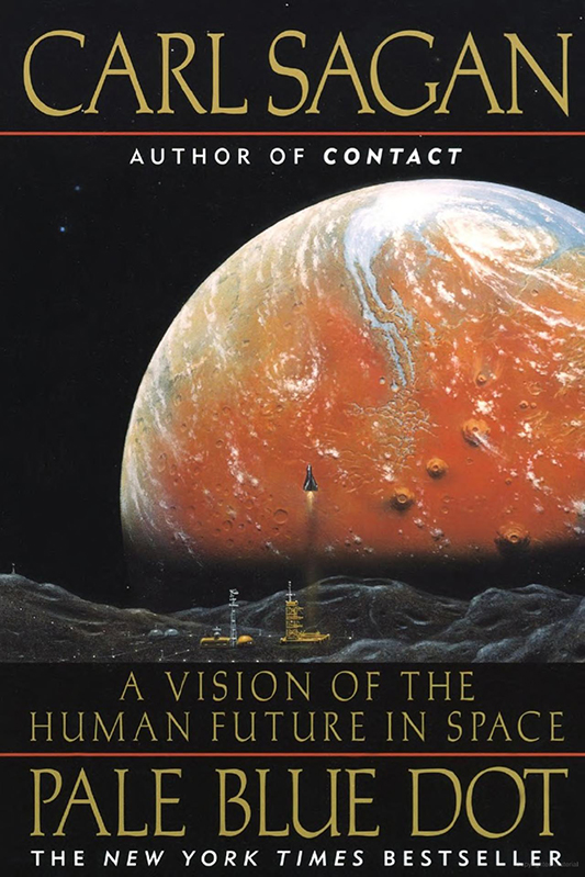 وهناك كتاب “نقطة زرقاء باهتة”، الذي يعتبر من أهم الكتب لعالم الفلك الأمريكي كارل ساغان، الذي ألّفه في عام 1994م، واعتمد فيه على صورة التقطتها مركبة الفضاء “فوياجر 2” لكوكب الأرض في 1990م، من على بعد ست مليارات كيلومتر؛ مما جعل الكوكب يظهر نقطة زرقاء غير واضحة المعالم. وهو يتحدث عن موقع كوكب الأرض في الكون، ومستقبل علوم الفضاء وارتباطها بمستقبل الإنسان.